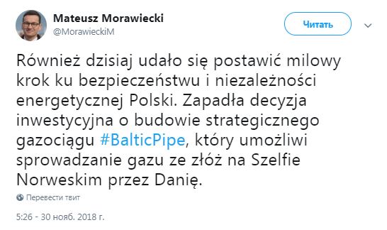 Соответствующее соглашение было подписано 30 ноября. "Сегодня нам удалось сделать квантовый скачок в сторону безопасности и независимости польского энергетического сектора. Было принято инвестиционное решение о создании стратегического газопровода Baltic Pipe, который позволит импортировать газ с норвежского шельфа через Данию", - заявил Моравецкий.