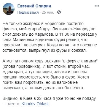 "В 11.30 на переезде у села Малиновка водитель фуры решил, что проскочит, но застрял. Когда понял, что поезд не остановится, выпрыгнул из фуры и сбежал. А мы на полном ходу въехали "в фуру с книгами" (слова проводника). И вот стоим, второй час, ждем кран, а тут полиция, зеваки и полсела пришли посмотреть, что было в фуре", - рассказал журналист.