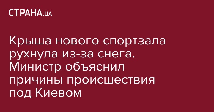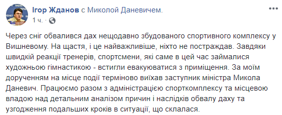 В Вишневом Киевской области крыша только недавно построенного спортивного комплекса обрушилась из-за снегопада, никто не пострадал. Об этом сообщил министр молодежи и спорта Украины Игорь Жданов на своей странице в Facebook.