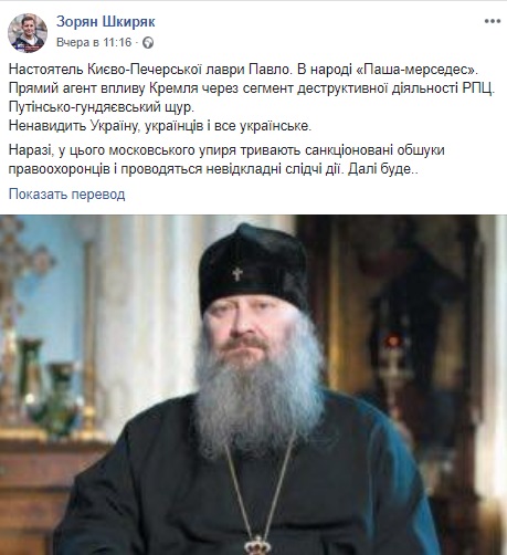 В УПЦ напомнили, что в день обыска советник главы МВД Зорян Шкиряк назвал владыку Павла "путинско-гундяевской крысой" и "московским упырем". То есть, совершил то же преступление, которое вменяют наместнику Лавры.