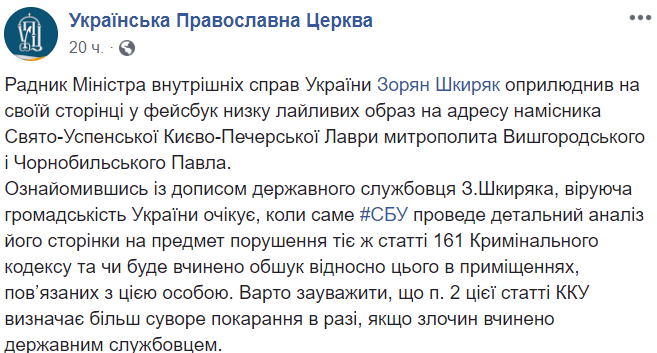 "Верующая общественность Украины ожидает, когда Служба безопасности Украины проведет детальный анализ его (Шкиряка - ред.) страницы на предмет нарушения той же статьи 161 Уголовного кодекса и проведет обыск в помещениях, связанных с этим лицом. Стоит заметить, что п. 2 этой статьи УК определяет более суровое наказание в случае, если преступление совершено государственным служащим", - говорится на Facebook-странице УПЦ МП.