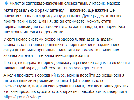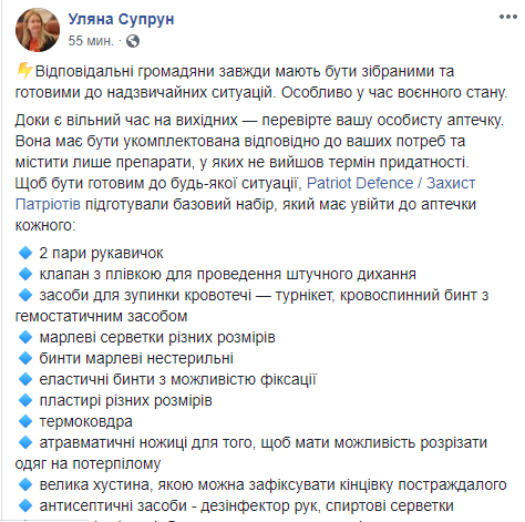 Супрун обратила внимание на то, что кроме наличия аптечки, граждане должны уметь оказывать домедицинскую помощь, и советует каждому пройти такой курс.