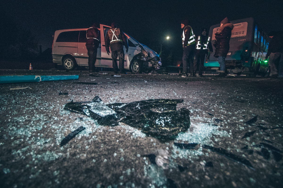 Установлено, что микроавтобус Mercedes на высокой скорости двигался по крайней левой полосе в сторону Борисполя, он пытался перестроиться и задел боковое зеркало автомобиля Mitsubishi Pajero. После чего микроавтобус стало сносить с дороги и он въехал в бок Hyundai. В результате чего ударило сзади маршрутку TATA.