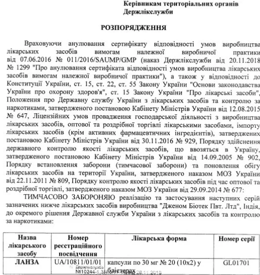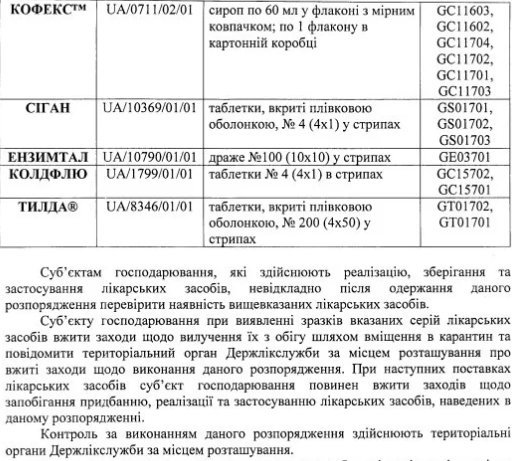В тексте документа сказано: "Временно запретить реализацию и применение лекарственного средства "Колдфлю", индийского производства, серий CG5702, CG15701, таблетки № 4 в стрипах, из-за аннулирования сертификата соответствия условий производства".