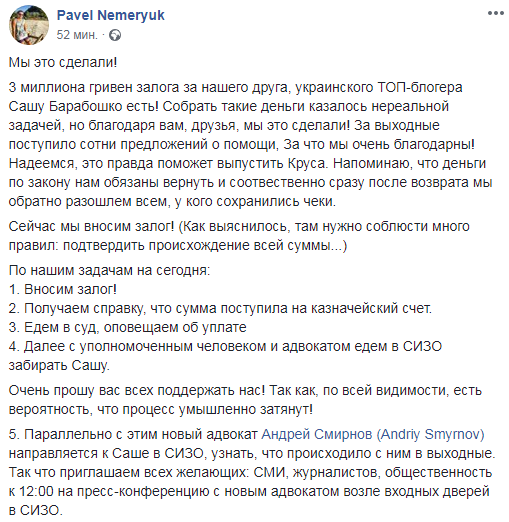 "Собрать такие деньги казалось нереальной задачей, но благодаря вам, друзья, мы это сделали! За выходные поступило сотни предложений о помощи, за что мы очень благодарны! Надеемся, это правда поможет выпустить Круса. Напоминаю, что деньги по закону нам обязаны вернуть и соответственно сразу после возврата мы обратно разошлем всем, у кого сохранились чеки", - указано на странице журналиста в Facebook.