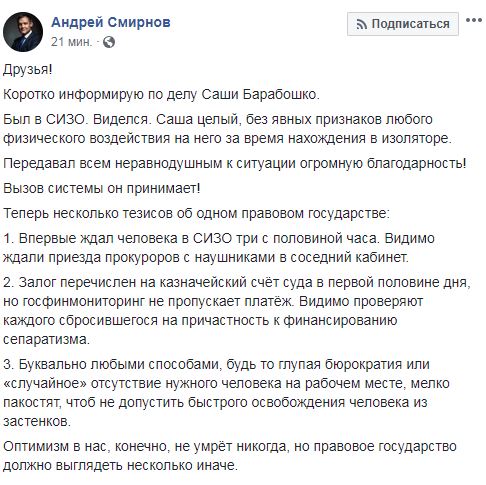 "Залог перечислен на казначейский счет суда в первой половине дня, но Госфинмониторинг не пропускает платеж. Видимо проверяют каждого сбросившегося на причастность к финансированию сепаратизма. Буквально любыми способами, будь то глупая бюрократия или "случайное" отсутствие нужного человека на рабочем месте, мелко пакостят, чтоб не допустить быстрого освобождения человека из застенков", - сообщил адвокат, который надеялся, что Барабошко выпустят сегодня к вечеру.