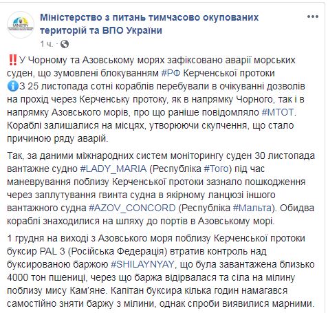 В частности, по данным международных систем мониторинга судов 30 ноября грузовое судно Lady Мaria (флаг Того) при маневрировании возле Керченского пролива получило повреждение из-за запутывания винта в якорной цепи другого грузового судна Azov Сoncord (флаг Мальты). Оба корабля были на пути к портам в Азовском море.