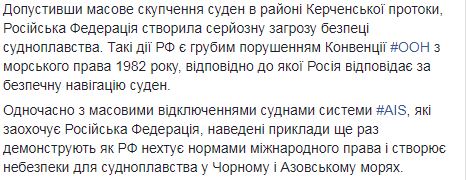 "Допустив массовое скопление судов в районе Керченского пролива, РФ создала серьезную угрозу безопасности судоходства. Такие действия РФ являются грубым нарушением Конвенции ООН по морскому праву 1982 года, в соответствии с которой Россия отвечает за безопасную навигацию судов. Одновременно с массовыми отключениями судами системы AIS, которые поощряет РФ, приведенные примеры еще раз демонстрируют, как РФ пренебрегает нормами международного права и создает опасности для судоходства в Черном и Азовском морях", - заявляют в МинВОТ.