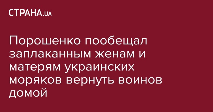 По словам Порошенко, украинские катера и буксир выполняли стандартную задачу по передислокации и ротации. Обращаясь к родственникам моряков, президент отметил, что в вопросе освобождения моряков Украина не идет на компромиссы. "Мы не идем ни на какие компромиссы. И когда говорят: есть ли какие-то предварительные условия для того, чтобы мы делали какие-либо дальнейшие шаги? Я говорю: первый шаг - воины домой", - сказал президент.