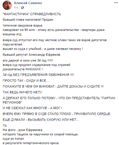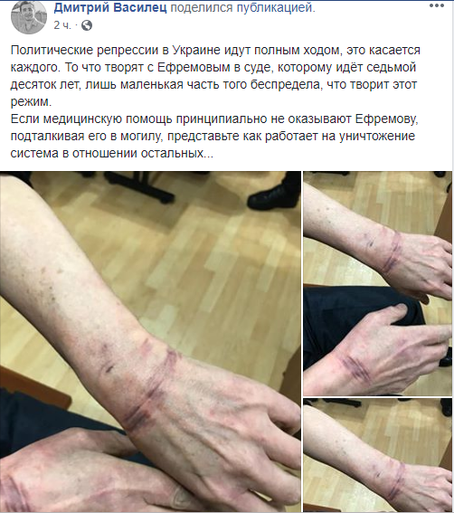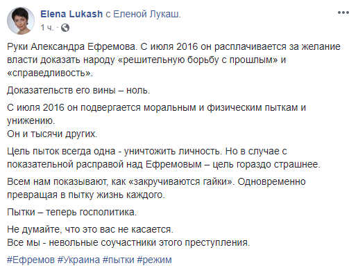 "Политические репрессии в Украине идут полным ходом, это касается каждого. То что творят с Ефремовым в суде, которому идёт седьмой десяток лет, лишь маленькая часть того беспредела, что творит этот режим. Если медицинскую помощь принципиально не оказывают Ефремову, подталкивая его в могилу, представьте как работает на уничтожение система в отношении остальных...".
