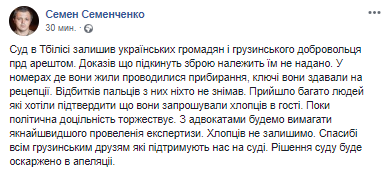 "Суд в Тбилиси оставил украинских граждан и грузинского добровольца под арестом", - написал Семенченко и добавил, что намерен совместно с адвокатам требовать проведения экспертизы, кроме того, будет подана апелляция.