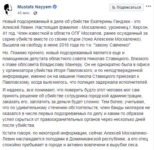"Новый подозреваемый в деле об убийстве Екатерины Гандзюк – это Алексей Левин (ранее эту информацию подтвердила "Страна"). Настоящая фамилия – Москаленко, уроженец г. Херсон, 41 год. Член известной в области ОПГ Москалов, ранее осужденный за серию убийств вместе со своим отцом (тоже Алексеем Москаленко). Вышел на свободу в июне 2016 года по т.н. "закону Савченко", - написал Найем. Он добавил, что Левин является помощником депутата областного совета Николая Ставицкого, близкого к главе облсовета Владиславу Мангеру.