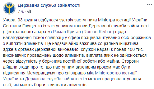 "Состоялась встреча заместителя министра юстиции Украины Светланы Глущенко с заместителем председателя Государственной службы занятости (Центрального аппарата) Романом Криганом относительно налаживания тесного сотрудничества в сфере трудоустройства лиц-должников по выплате алиментов", - говорится в сообщении.
