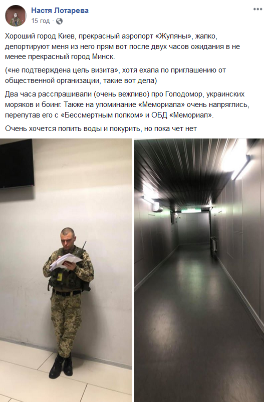 "Хороший город Киев, прекрасный аэропорт "Жуляны", жалко, депортируют меня из него прям вот после двух часов ожидания в не менее прекрасный город Минск. "Не подтверждена цель визита", хотя ехала по приглашению от общественной организации, такие вот дела. Два часа расспрашивали (очень вежливо) про Голодомор, украинских моряков и Боинг. Также на упоминание "Мемориала" очень напряглись, перепутав его с "Бессмертным полком" и ОБД "Мемориал", - написала журналистка.