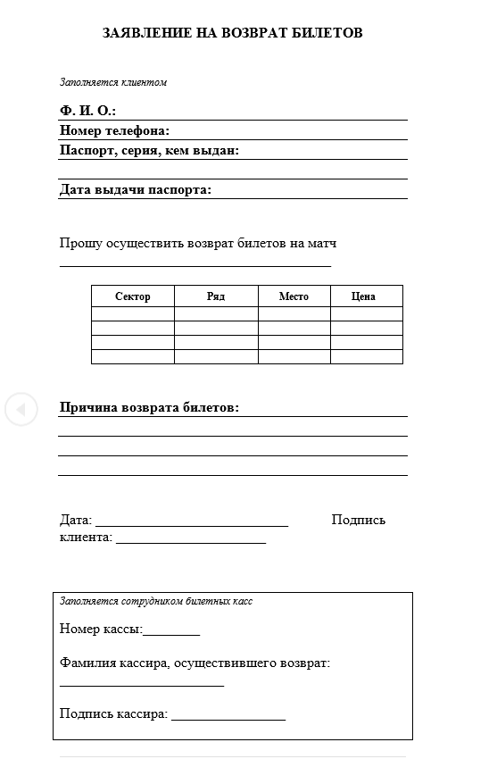 1. Билет приобретен в кассах ОСК "Металлист". Возврат денег осуществляется только в кассах с 5 декабря. Кассир принимает заполненное заявление и оформляет акт о выдаче средств. Сам бланк выглядит так.
