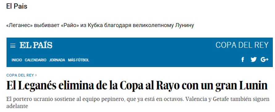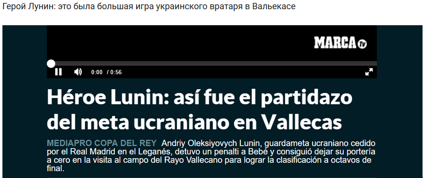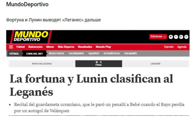 Лунин отбил пенальти, который пробивал Бебе при счете 1 - 0. Игра так и завершилась, и в итоге Леганес одержал выездную победу. Команда Лунина по итогам двух матчей (общий счет 3 - 2) прошла дальше в 1/8 финала.