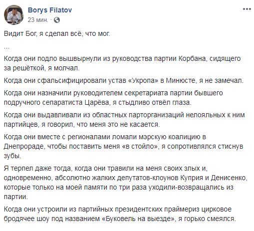 "Когда они подло вышвырнули из руководства партии Корбана, сидящего за решеткой, я молчал. Когда они сфальсифицировали устав "Укропа" в Минюсте, я не замечал. Когда они назначили руководителем секретариата партии бывшего подручного сепаратиста Царёва, я стыдливо отвел глаза. Когда они выдавливали из областных парторганизаций нелояльных к ним партийцев, я говорил, что меня это не касается. Когда они вместе с регионалами ломали мэрскую коалицию в Днепрораде, чтобы поставить меня "стойло", я сопротивлялся стиснув зубы", - напиал он.