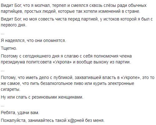 Эту информацию политик также озвучил в Facebook. Он отметил, что "сделал все что мог" и терпел, но терпение его кончилось.