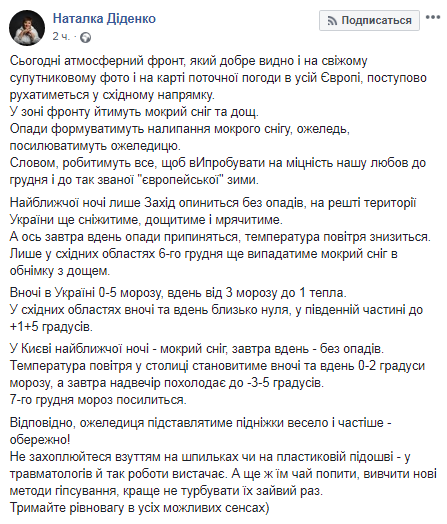 5 декабря атмосферный фронт, царящий во всей Европе, постепенно будет двигаться в восточном направлении - в сторону Украины. Об этом сообщила синоптик Наталья Диденко на своей странице в Facebook.