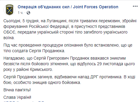"5 декабря в Луганской области после длительных переговоров вооруженные формирования Российской Федерации, в присутствии представителей ОБСЕ, передали украинской стороне тело погибшего украинского воина. Во время проведения процедуры опознания было установлено, что это тело солдата Сергея Проданюка", - говорится в отчете.