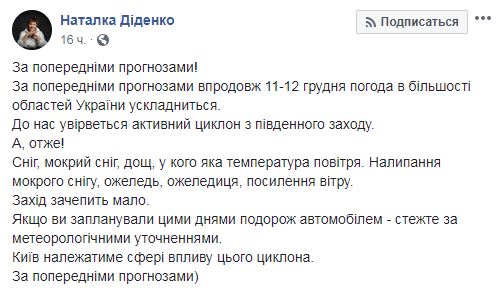 В Украину 11-12 декабря ворвется циклон с юго-запада и погода в большинстве областей усложнится. Об этом сообщает синоптик Наталья Диденко в Facebook.