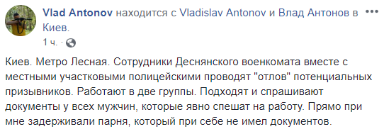 Сегодня, 6 декабря, в Киеве недалеко от метро "Лесная" второй день проводят "отлов" потенциальных призывников. Люди в камуфляжной форме вместе с полицейскими подходят к парням и требуют предоставить документы о прохождении воинской службы. Об этом сообщает руководитель проекта dtp.kiev.ua Влад Антонов в Facebook.
