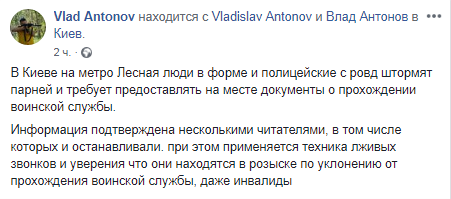 5 декабря в соцсетях появилась информация, что в столице люди в форме проводят рейды по вылавливанию молодых людей, которые уклоняются от воинской службы. Об этом на своей странице в Facebook сообщил руководитель проекта dtp.kiev.ua Владислав Антонов.