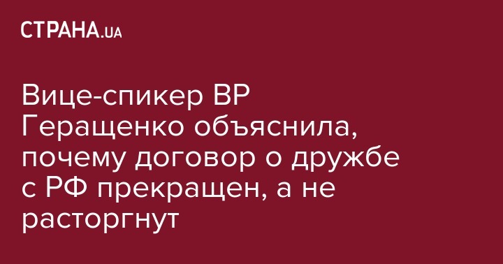 Действие Договра о дружбе и сотрудничестве с РФ не расторгнуто, а прекращено. Об этом на своей странице в соцсети написала вице-спикер ВР Ирина Геращенко, объяснив, что между этими понятиями - большая разница.