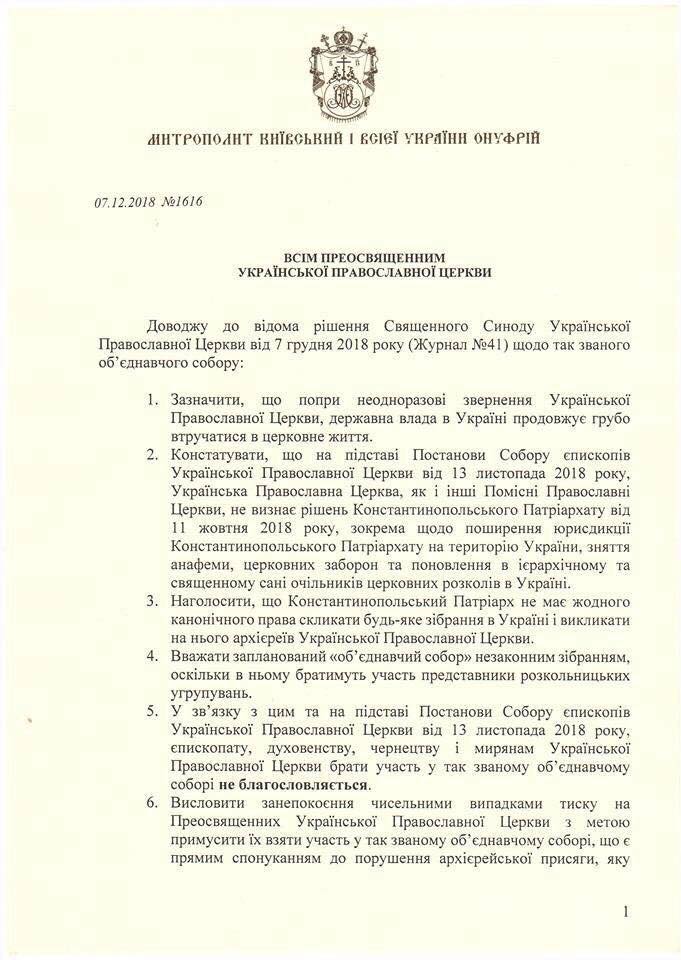 А предстоятель Украинской православной церкви (МП) митрополит Онуфрий отправил письмо с приглашением на "объединительный Собор" обратно главе Константинопольского патриархата Варфоломею. Он запечатал послание в конверт и оставил его без ответа.
