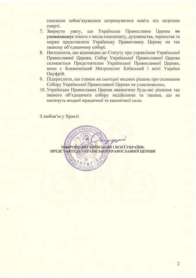 - Обратить внимание, что Украинская Православная Церковь не уполномочила никого из числа епископата, духовенства, монашества и мирян представлять Украинскую Православную Церковь на так называемом объединительном соборе.