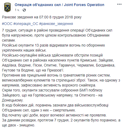 "В ходе боевых действий, ранения получили два военнослужащих Объединенных сил, один из них - смертельных. С начала этого периода, враг огневой активности не проявлял. По данным разведки, в течение 7 декабря, 2 боевиков были ранены, а еще двух - уничтожены ", - добавили в пресс-центре ООС.
