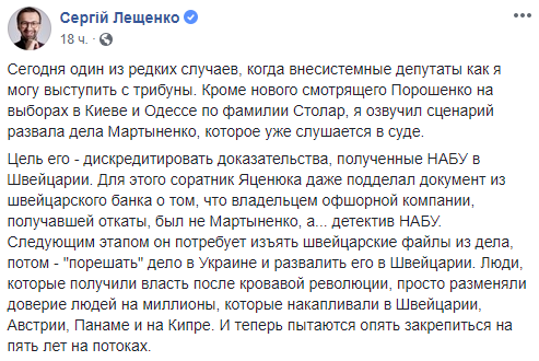 "Сегодня один из редких случаев, когда внесистемные депутаты как я могу выступить с трибуны. Кроме нового смотрящего Порошенко на выборах в Киеве и Одессе по фамилии Столар, я озвучил сценарий развала дела Мартыненко, которое уже слушается в суде", - рассказал нардеп.