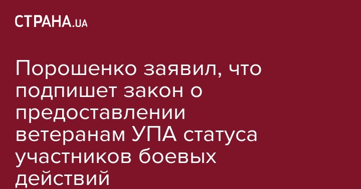 Президент Украины Петр Порошенко пообещал, что подпишет закон о предоставлении статуса ветеранов участникам УПА после его передачи из парламента. Об этом он заявил во время выступления по случаю 150-летия образования общества "Просвита" во Львове, передает УНН.