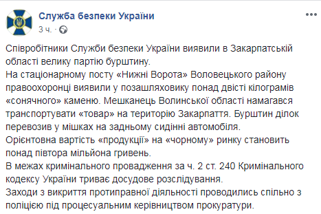 "На стационарном посту Нижние Ворота Воловецкого района правоохранители обнаружили во внедорожнике более 200 кг янтаря. Житель Волынской области пытался транспортировать товар на территорию Закарпатья", - сказано в сообщении.