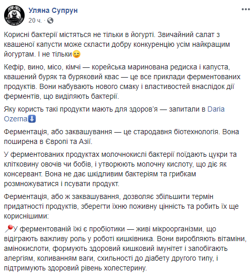 "Кефир, вино, мисо, кимчи - корейская маринованная редиска и капуста, квашеная свекла и свекольный квас - это все примеры ферментированных продуктов. Они приобретают новый вкус и свойств в результате действия ферментов, что выделяют бактерии", - пишет чиновник.