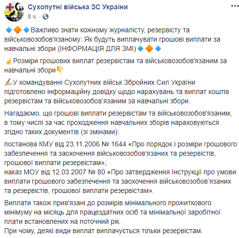 Резервистам и военнообязанным заплатят деньги за участие в учебных сборах, которые проводят в связи с введением военного положения. Об этом в Facebook сообщает пресс-служба Сухопутных войск Вооруженных сил Украины.