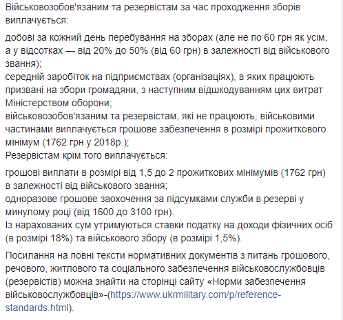 - военнообязанным и резервистам, которые не работают, воинские части выплачивают денежное обеспечение в размере прожиточного минимума (1762 грн в 2018 году).