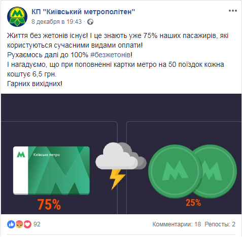 В течение 11 месяцев 2018 года жетонами воспользовались 25% пассажиров киевского метро. В 2017 году "жетонный" показатель достиг 38 процентов. Об этом передает УНН со ссылкой на пресс-службу КП "Киевский метрополитен".