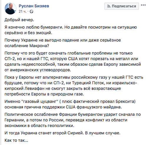Именно "газовый цуцванг" (плюс фактический провал Брексита) основная причина поддержки США французкого майдана.