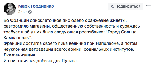 Майдановский активист Марк Гордиенко назвал Францию "добычей для Путина" и назвал участников акций протеста "одноклеточным дном".