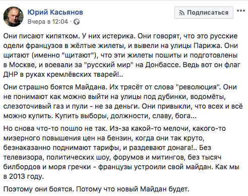 "Они писают кипятком. У них истерика. Они говорят, что это русские одели французов в жёлтые жилеты, и вывели на улицы Парижа. Они щитают (именно "щитают"), что эти жилеты пошиты и подготовлены в Москве, и воевали за "русский мир" на Донбассе. Ведь вот он флаг ДНР в руках кремлёвских тварей!..