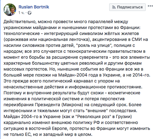 "Действительно, можно провести много параллелей между украинскими майданами и нынешними протестами во Франции: технологические - интегрирующий символизм жёлтых жилетов (оранжевая или национальная ленточка), акцентирование в СМИ на насилии силовиков против детей, "рояль на улице", полиция с народом; все это случается с технократическим правительством в момент его борьбы за расширение суверенитета - это все элементы характерные большинству цветных революций и другим формам массовых протестов. Но, нынешние события во Франции все же в большей мере похожи на Майдан-2004 года в Украине, а не 2014-го. Это прежде всего политический карнавал с упором на ненасильственные действия и информационное противостояние. Поэтому и внутренние результаты будут схожи - косметические изменения в политической системе и потеря перспектив переизбрания Президента (Макрона) на следующий срок. Более интересными и тяжелыми могут стать "внешние" последствия. Майдан 2004-го в Украине (как и "Революция роз" в Грузии) кардинально изменил внешнюю политику РФ и соответственно ситуацию в восточной Европе, протесты во Франции могут изменить не только ЕС, но и западный мир в целом".