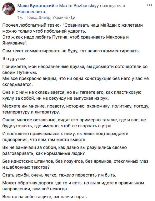Это ж как надо любить Путина, чтоб сравнивать Макрона и Януковича".