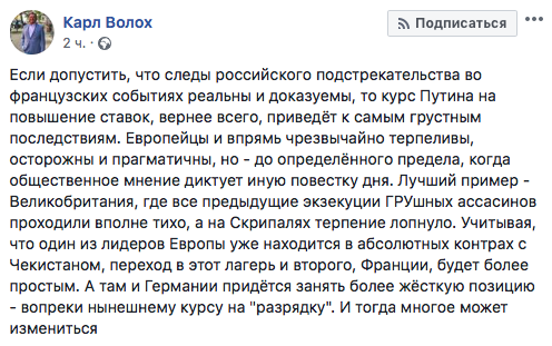 "Если допустить, что следы российского подстрекательства во французских событиях реальны и доказуемы, то курс Путина на повышение ставок, вернее всего, приведёт к самым грустным последствиям. Европейцы и впрямь чрезвычайно терпеливы, осторожны и прагматичны, но - до определённого предела, когда общественное мнение диктует иную повестку дня. Лучший пример - Великобритания, где все предыдущие экзекуции ГРУшных ассасинов проходили вполне тихо, а на Скрипалях терпение лопнуло. Учитывая, что один из лидеров Европы уже находится в абсолютных контрах с Чекистаном, переход в этот лагерь и второго, Франции, будет более простым. А там и Германии придётся занять более жёсткую позицию - вопреки нынешнему курсу на "разрядку". И тогда многое может измениться".