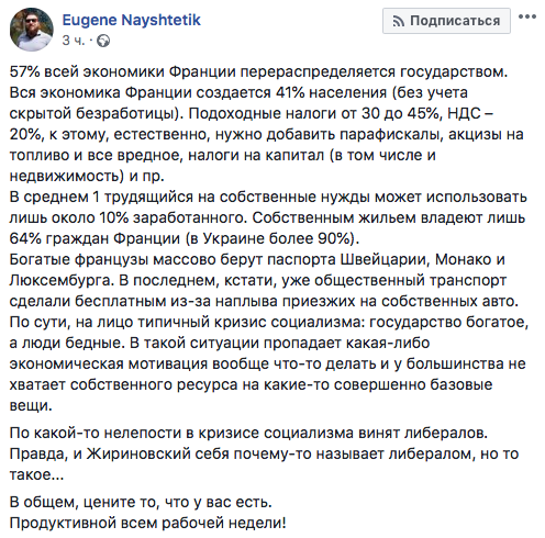 "57% всей экономики Франции перераспределяется государством. Вся экономика Франции создается 41% населения (без учета скрытой безработицы). Подоходные налоги от 30 до 45%, НДС – 20%, к этому, естественно, нужно добавить парафискалы, акцизы на топливо и все вредное, налоги на капитал (в том числе и недвижимость) и пр.