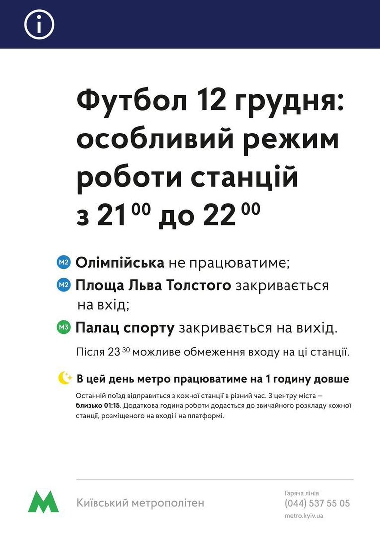 21:23 Сегодня метро в Киеве будет работать на час дольше. Финальный поезд отправится из центра города в 1:15 ночи. Всё для болельщиков.