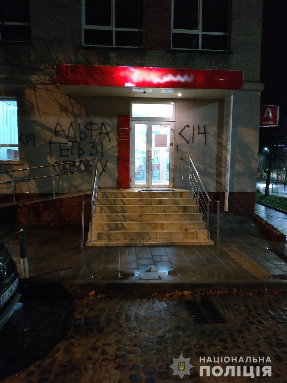 Уточняется, что информация о произошедшем поступила в  правоохранительные органы около 3:30 ночи. Предположительно атака на банк была осуществлена около 2:00.  Неизвестные оставили на стене возле входа в отделение надписи краской: "Альфа геть зі Львова" и "С14". Также хулиганы разбили дверь отделения.