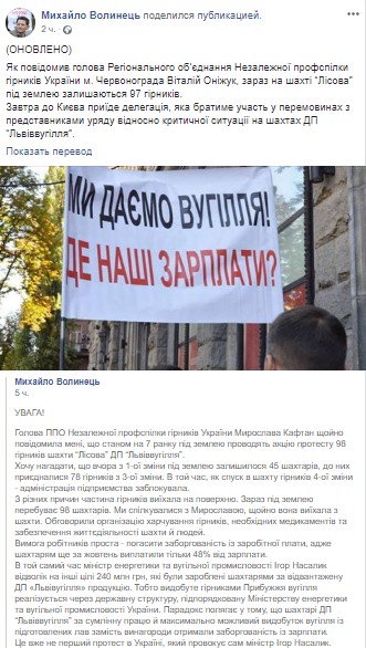 На Львовщинне горняки шахты Лесная начали акцию протеста под землей, требуя выплаты долга по заработной плате. Об этом 11 декабря написал на своей странице в Facebook председатель Независимого профсоюза горняков Украины Михаил Волынец.