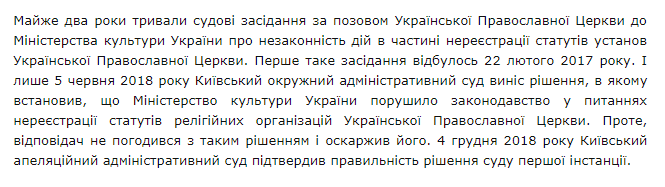 "4 декабря 2018 года Киевский апелляционный административный суд подтвердил правильность решения суда первой инстанции", – подчеркнул митрополит Антоний.