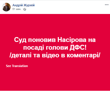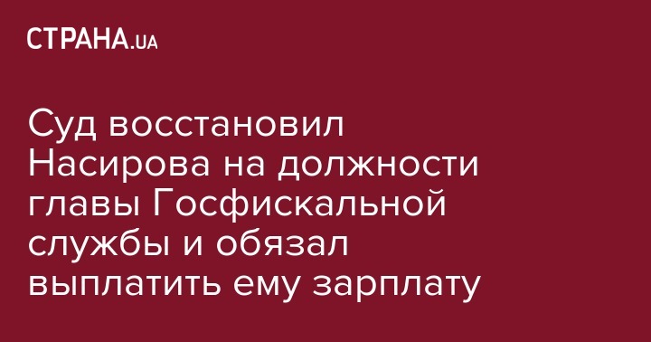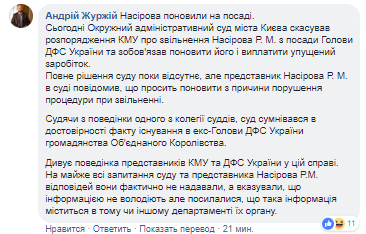 В комментарии к посту он сообщил подробности. "Сегодня Окружной административный суд города Киева отменил распоряжение КМУ об увольнении Насирова Г. Н. с должности председателя ГФС Украины и обязал восстановить его и выплатить упущенный заработок", - пишет нардеп.